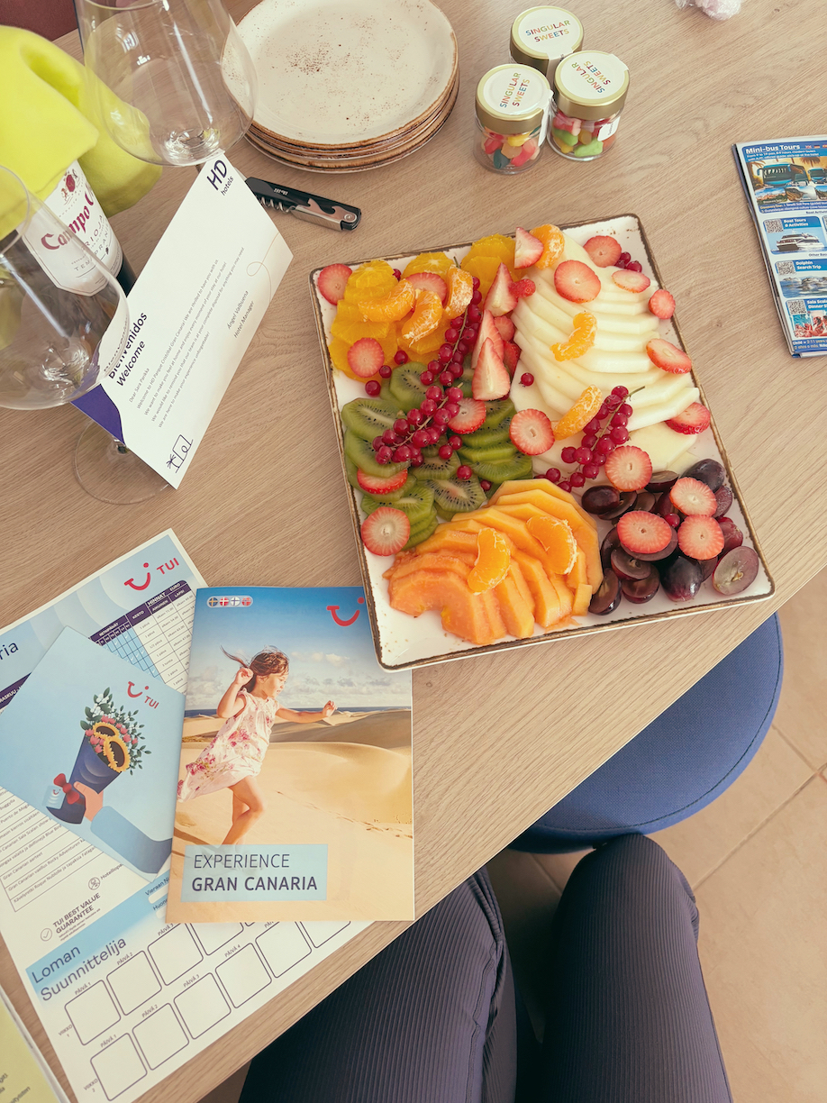 Lentoaika Gran Canarialle on noin kuusi tuntia ja molempiin suuntiin lento meni oikein mukavasti. Oltiin tilattu ruoat koneeseen ja se oli kiva ”ohjelmanumero” kaiken muun pelaamisen, lukemisen ja ohjelmien katsomisen ohella. TUIn lennoilla on suomenkielinen palvelu ja ihanasti lentohenkilökunta otti lapset huomioon ja siitä tuli tosi kiva fiilis. Veikkaan, että usein vanhempia jännittää miten lento menee (ainakin meitä) niin toisten hymy tai jutustelu lämmittää aina mieltä.